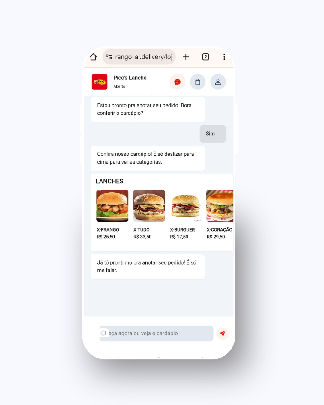 O chatbot conversa com o cliente, sugere opções e tira dúvidas, tornando o pedido muito mais simples e natural.